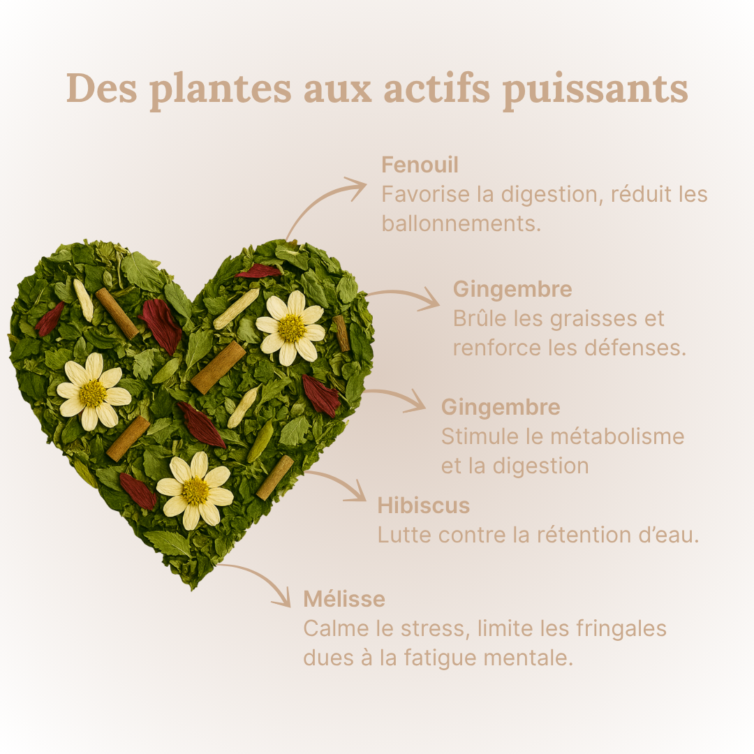 🍃 Verveine : Facilite la digestion et réduit les envies de grignotage émotionnel. Apaise le système nerveux, favorise la détente.