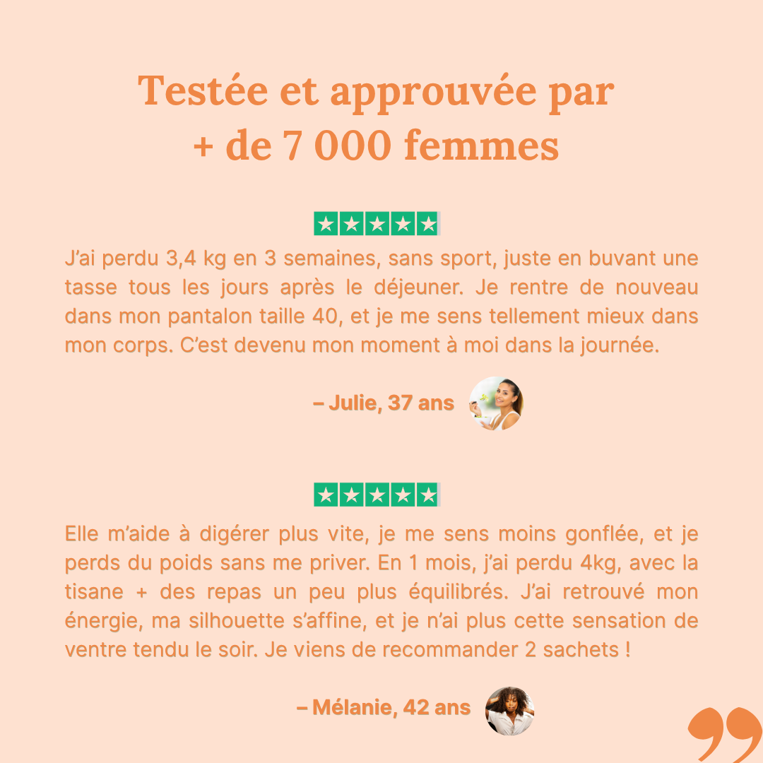 Je cherchais un brûleur de graisses efficace... alors celui-là est de loin le meilleur ! Depuis que je bois la tisane Brûle-Graisses tous les midis, j’ai vu une vraie différence : moins de gonflements, une digestion plus légère, et surtout… j'ai vraiment dégonflé au niveau du ventre, des bras et des hanches. Au 10ème jours, j'étais déjà à -2,9 kg, et j'ai fait aucun sport !!! Au final, en 30 jours, j'ai perdu 7kg au total. En plus, j'ai adoré son goût légèrement piquant !