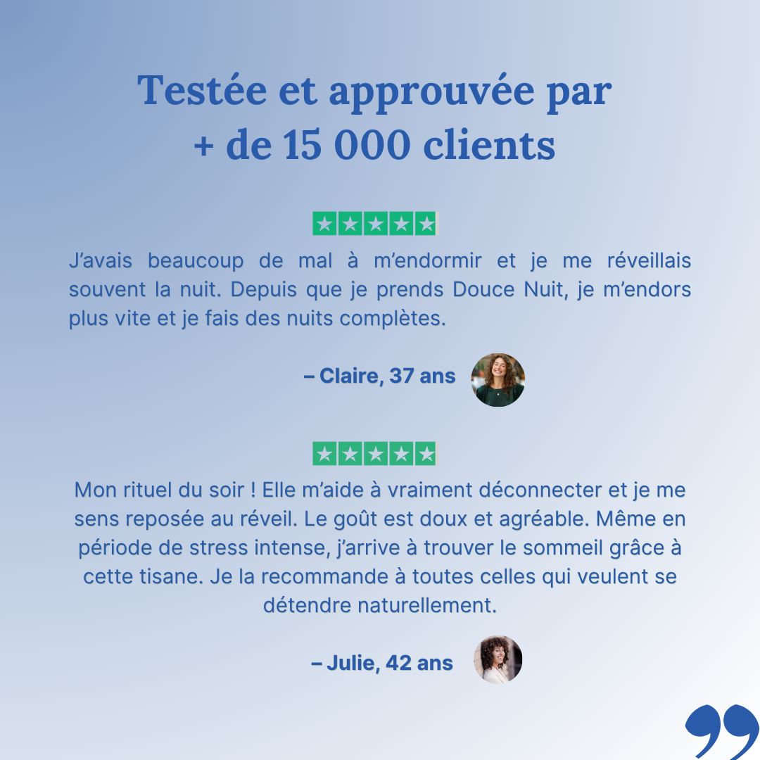 Entre mon boulot stressant et mes soirées à m’occuper des enfants, je n’arrivais plus à décrocher le soir. Je restais des heures à ruminer avant de dormir et je me réveillais fatiguée. Depuis que je bois Douce Nuit tous les soirs, je m’endors en moins de 20 minutes et mes nuits sont beaucoup plus calmes. Je me réveille reposée et de meilleure humeur. C’est devenu mon petit rituel sacré de fin de journée.