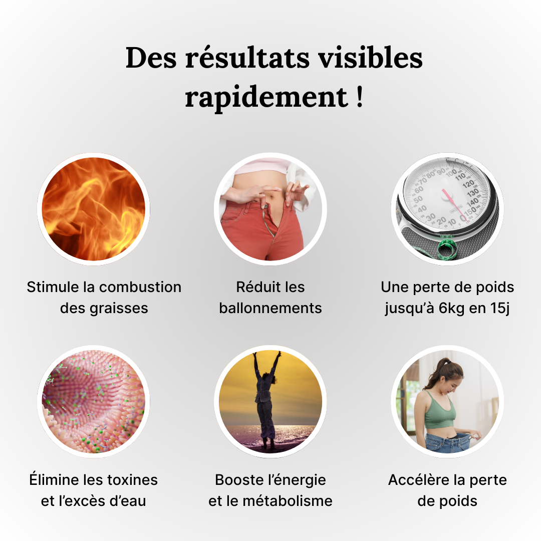 Les premiers effets sont visibles en quelques jours, avec une sensation de légèreté et plus d’énergie. Pour une perte de poids optimale, une cure de 30 à 45 jours est recommandée.