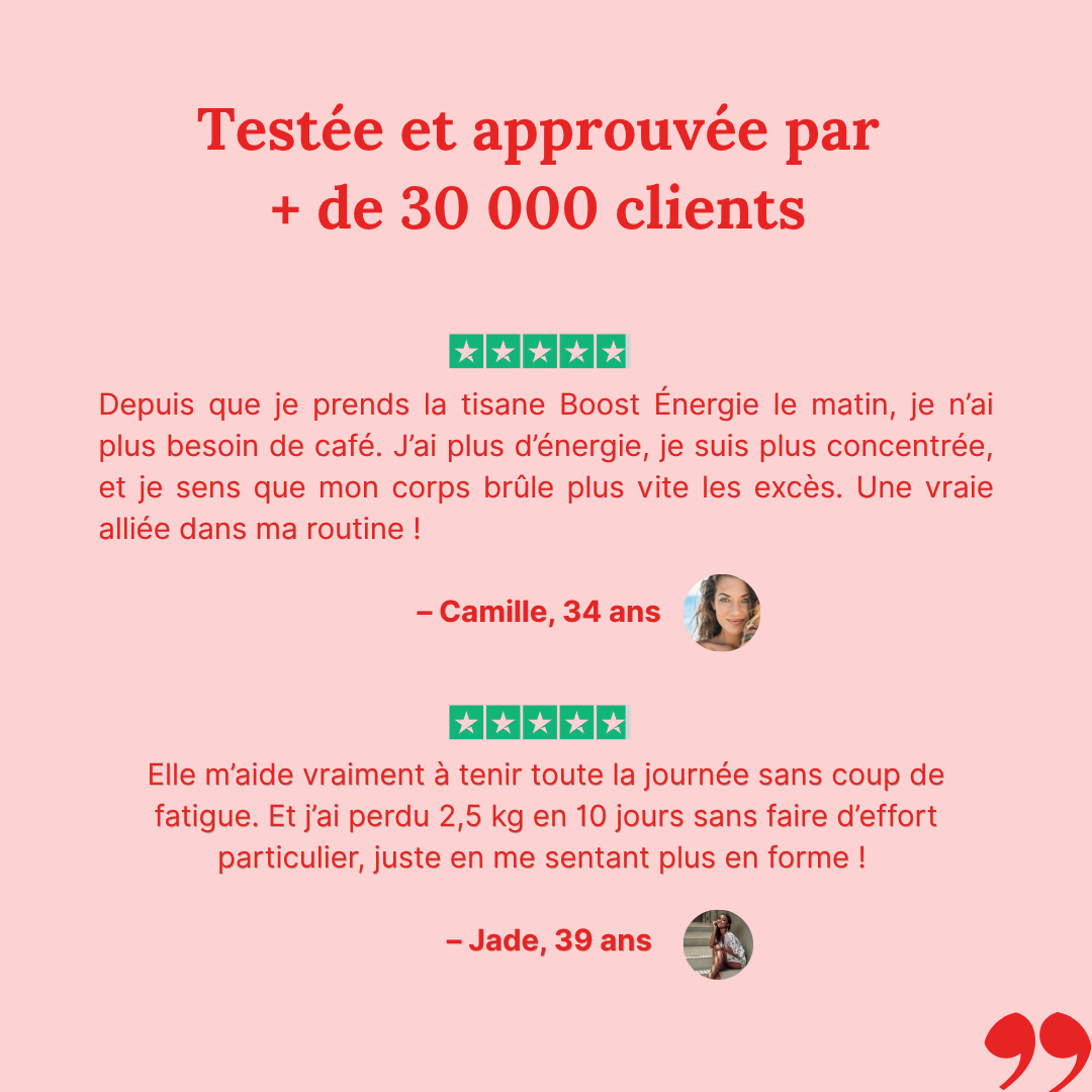 Je suis maman, je travaille, je cours partout. Avant, je démarrais ma journée à plat, et j’enchaînais les cafés. Depuis que j’ai intégré la Tisane Boost Énergie et la tisane Brûle Graisses dans ma routine, je sens une vraie différence. Moins de fatigue, plus d’énergie stable, et même un petit effet coupe-faim que je ne soupçonnais pas. Depuis, je me suis mise à la corde à sauter ! J’ai fait une cure de 2 mois et j'ai perdu + de 7kg au total !